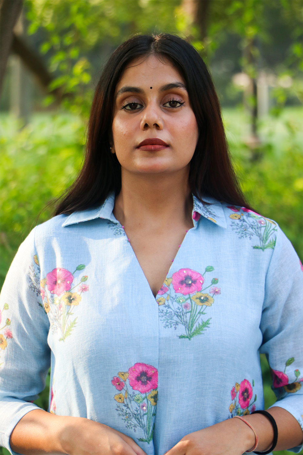 This light blue floral printed co-ord set features a V-neck with a collar, crafted in soft linen-cotton fabric for a flowy and comfortable feel. The easy-breezy design makes it perfect for summer and spring days. With its floral print and relaxed fit, it’s a chic pick for casual outings, coffee dates, college wear, or everyday comfort. Intended to be worn loose for maximum comfort and style.