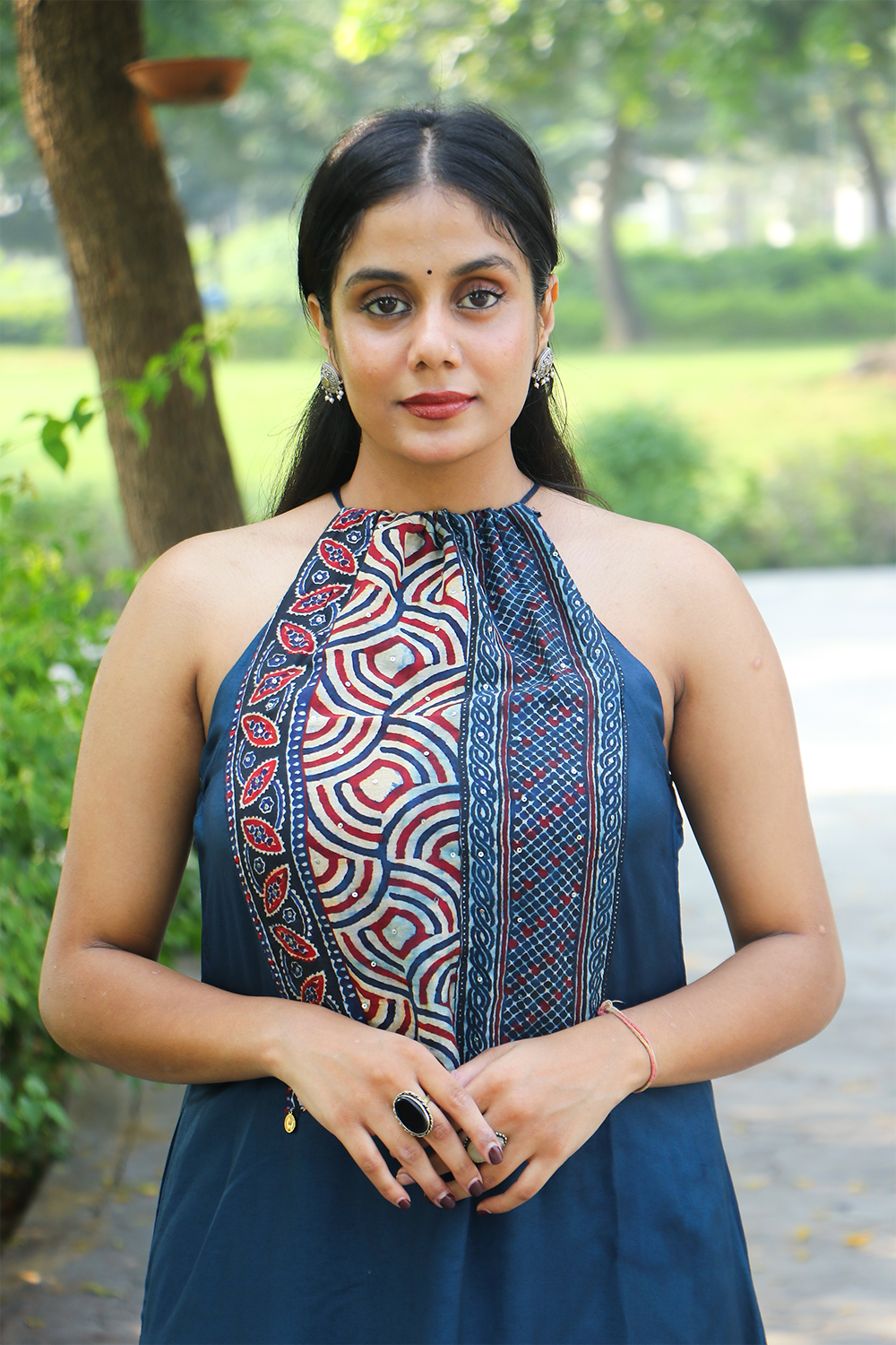 Kurta: Halter neck, A-line silhouette, embroidered front