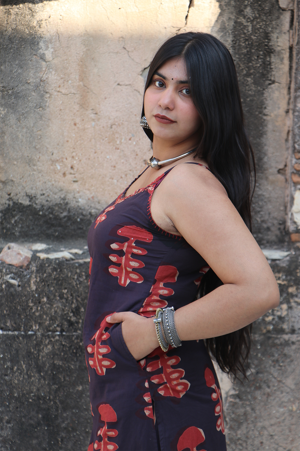 This indigo cotton suit set stands out with its unique mushroom motifs, crafted on soft, breathable cotton that feels easy and comfortable through the day. The camisole-style kurta features delicate sequin detailing along the neckline, adding a subtle touch of highlight to the contemporary silhouette. Its straight-cut design offers a relaxed, flattering fit that pairs beautifully with the coordinated cotton pants.